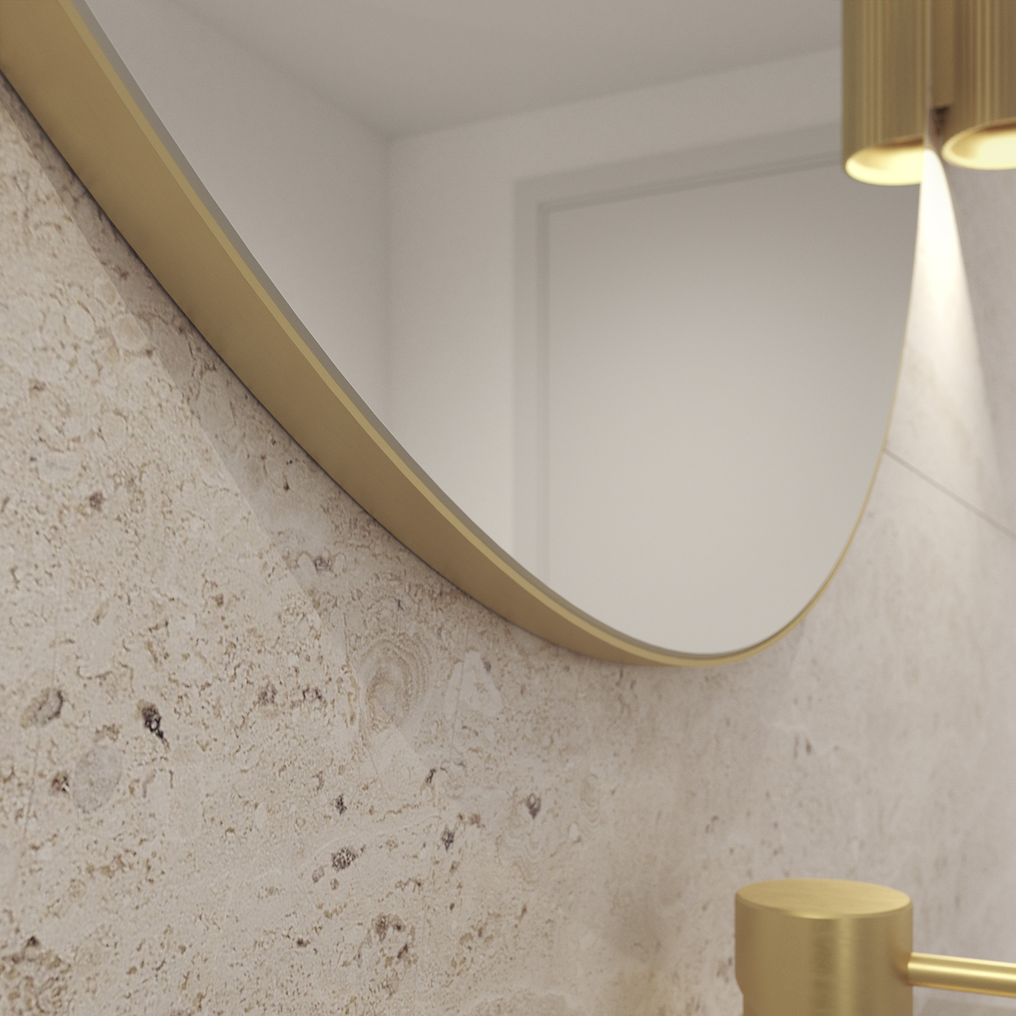 Refine, en rund spegel med ram, kännetecknas av det faktum att spegelytan är i jämnhöjd med ramen, och de två materialen smälter samman till en enhet. Ramen har en slimmad, stram look och tillsammans med den vackra runda formen får du en nätt, exklusiv look.