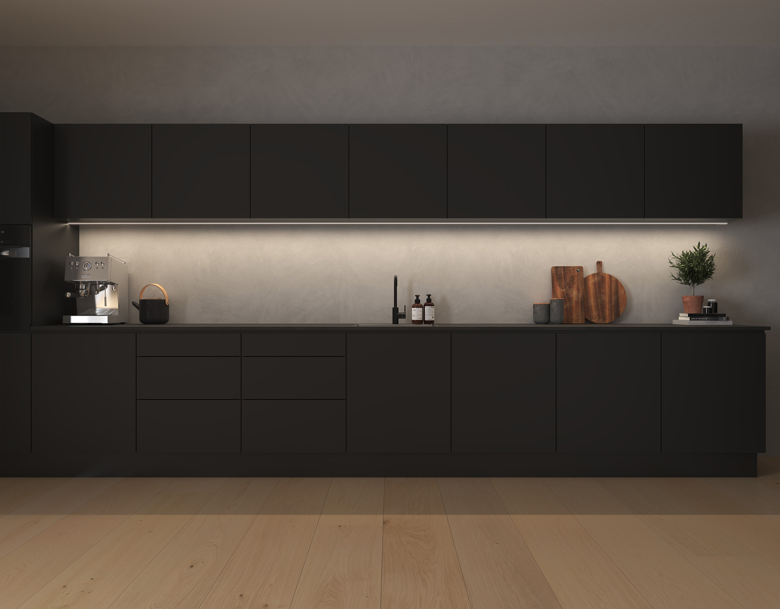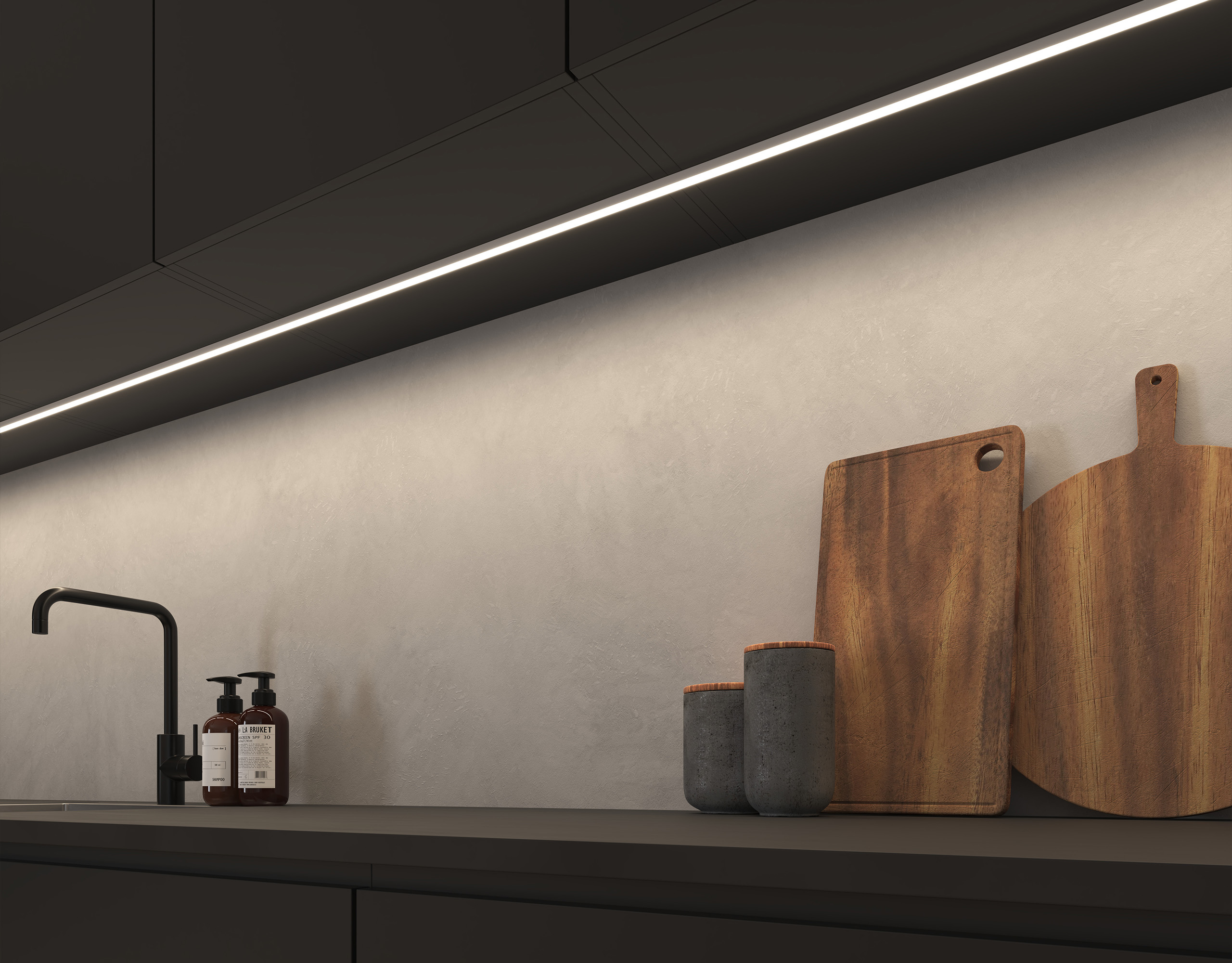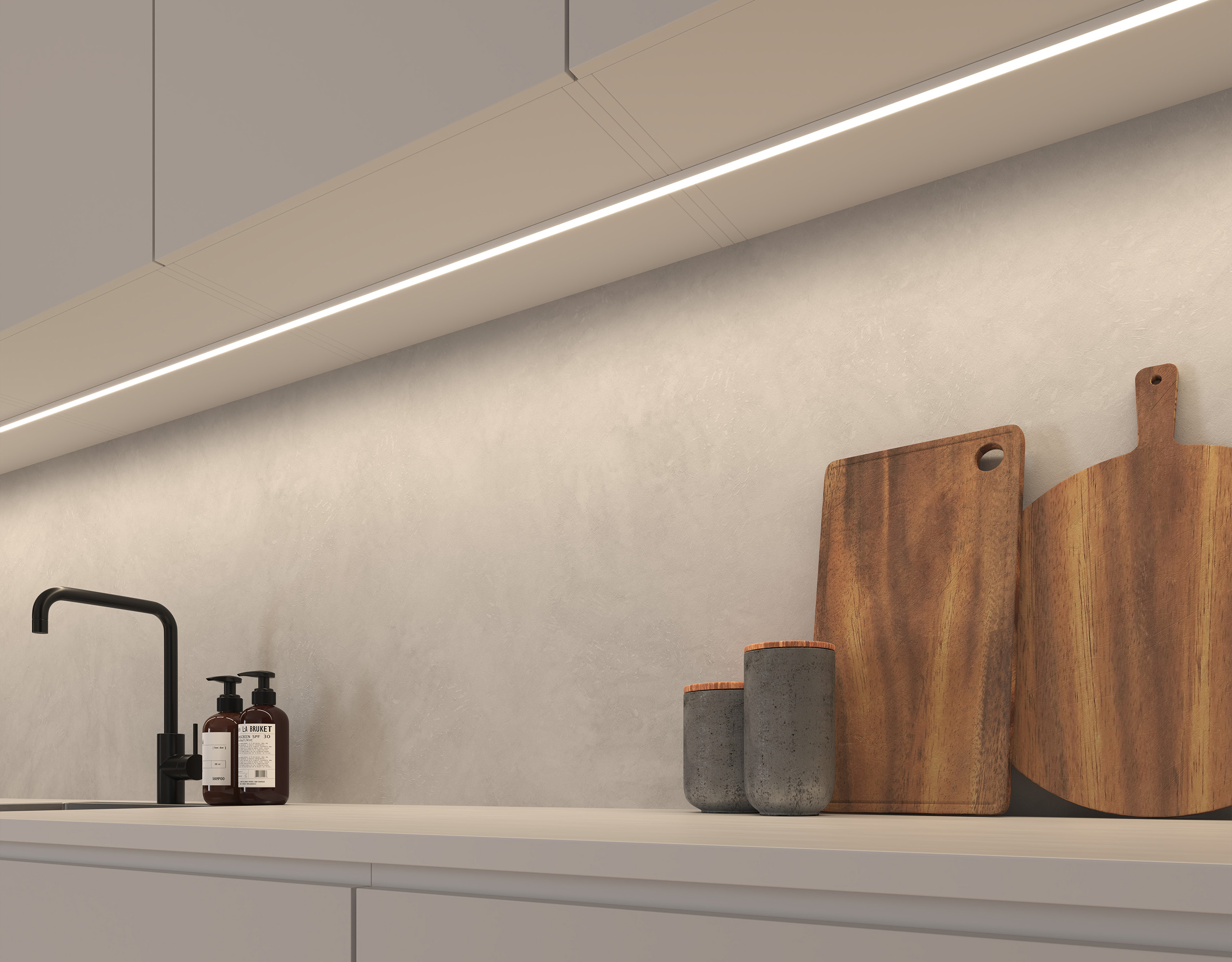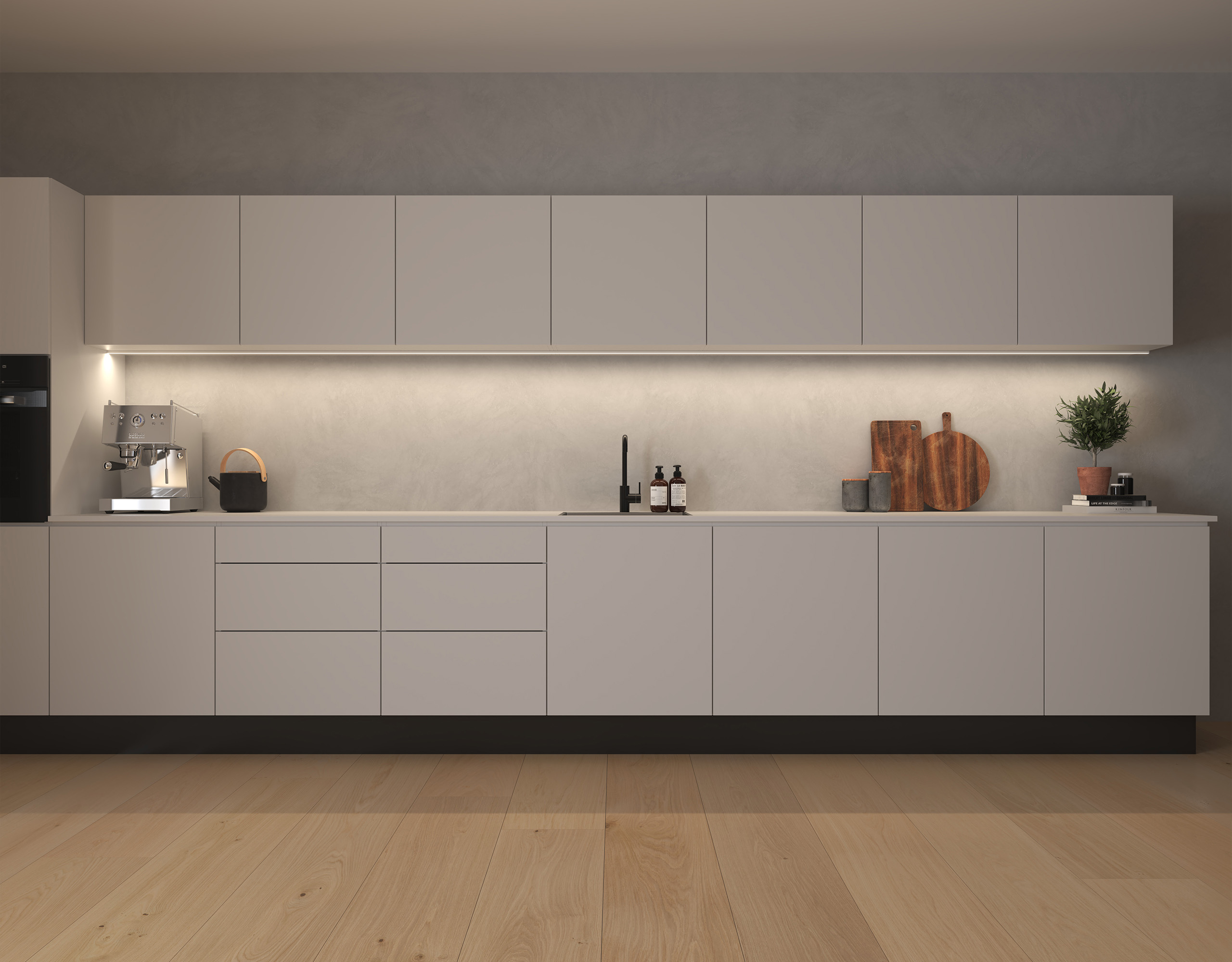 Linjärt ljus för utanpåliggande montering under skåp och hyllor. Det modulära systemet LEDconnect låter dig skapa exakt den längd du behöver. Enkel att eftermontera.