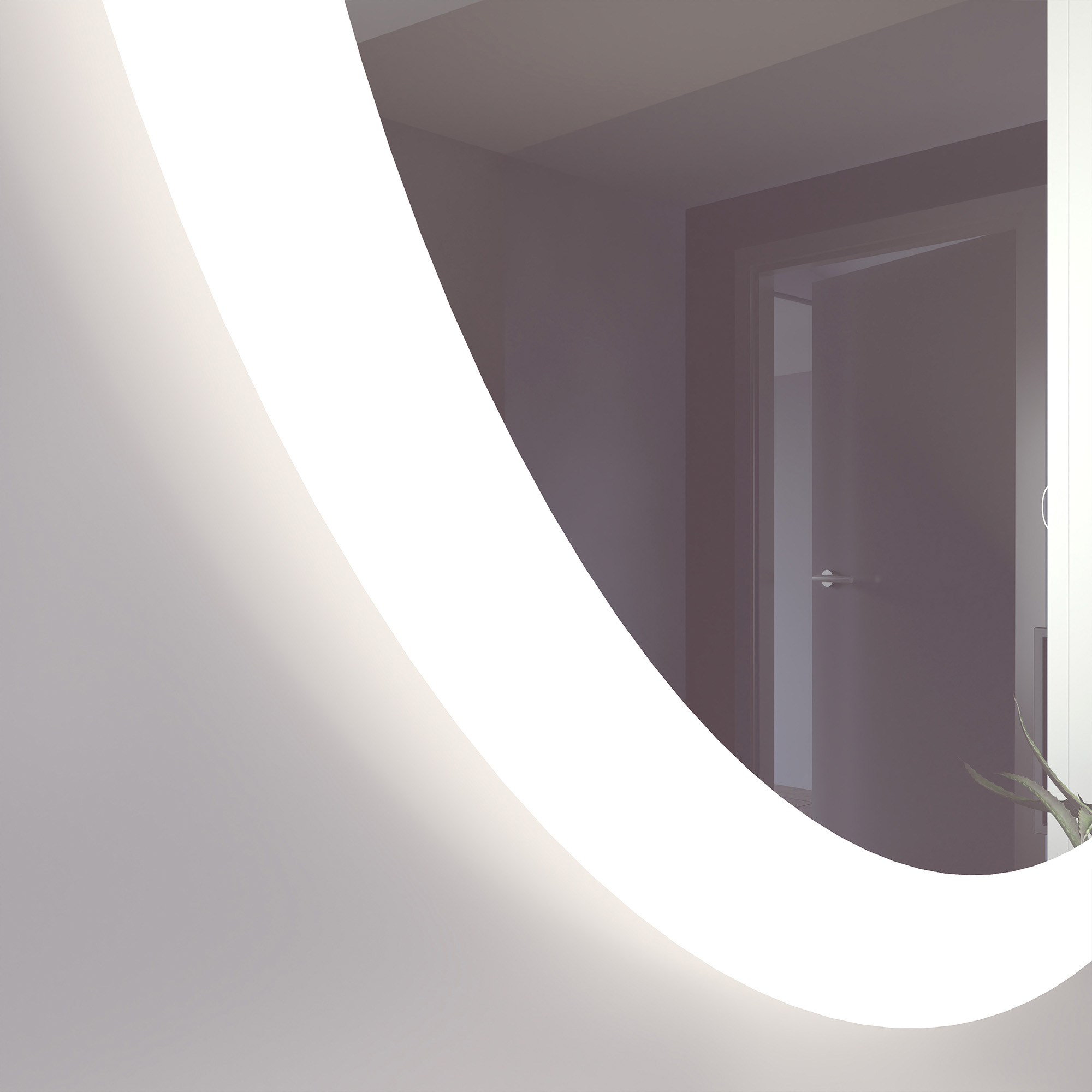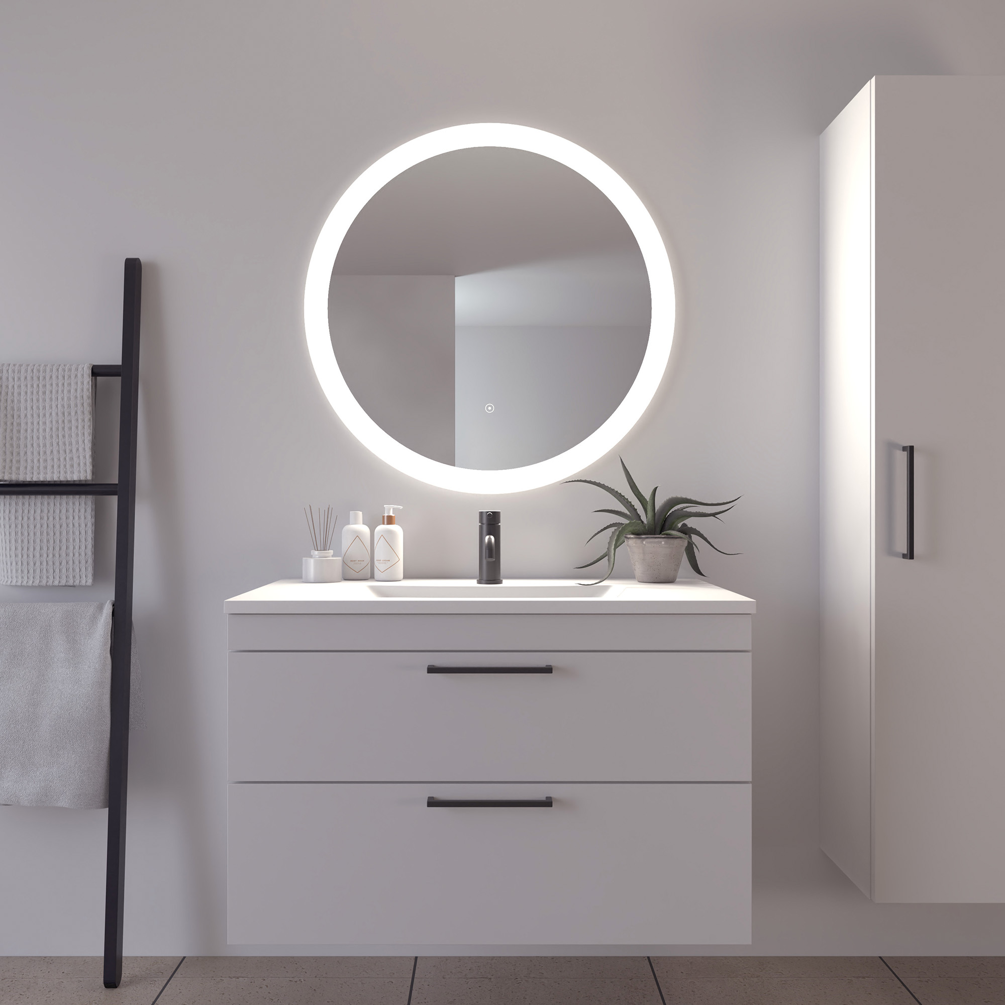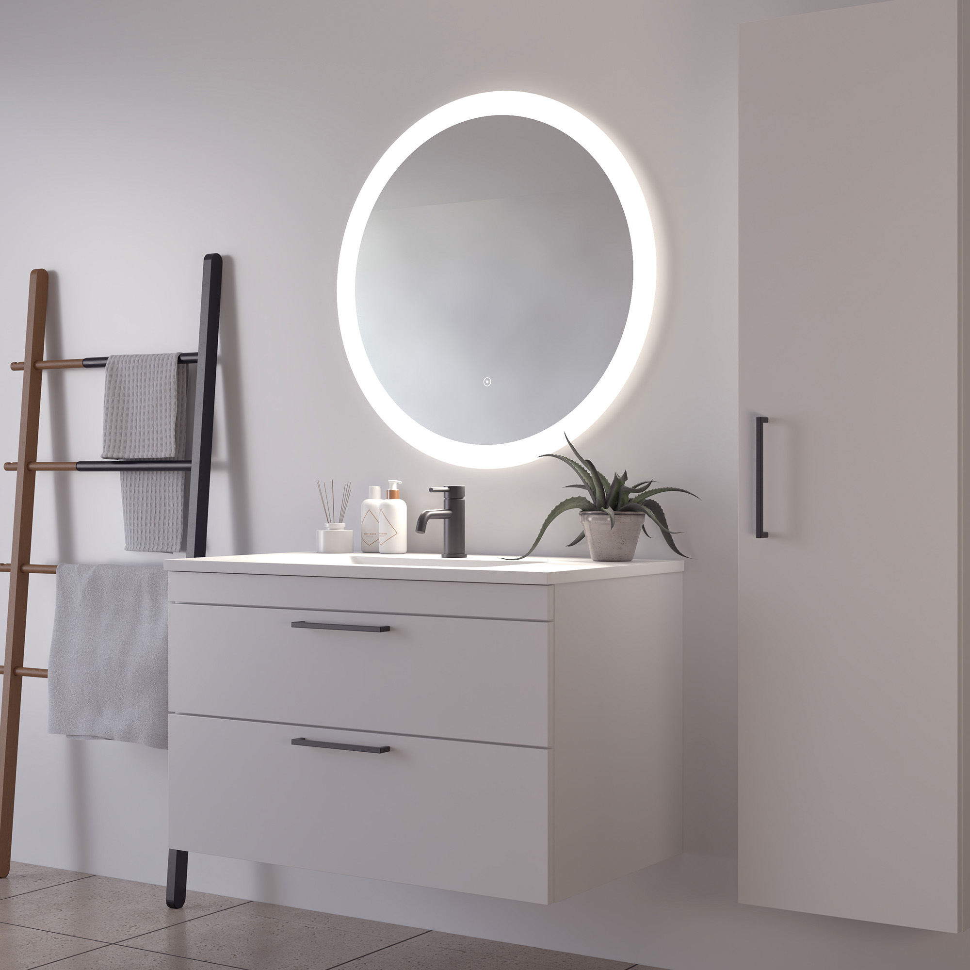 Vega, en rund badrumsspegel med LED belysning, har ett brett dimbart ljusfält hela vägen runt spegelkanten. Ljuset styrs på touch-fältet på spegelytan, där du enkelt justerar ljusstyrkan, tänder och släcker ljuset. Spegeln kommer ihåg den senaste använda positionen när du använder strömbrytaren eller tänder igen via touch-fältet.
