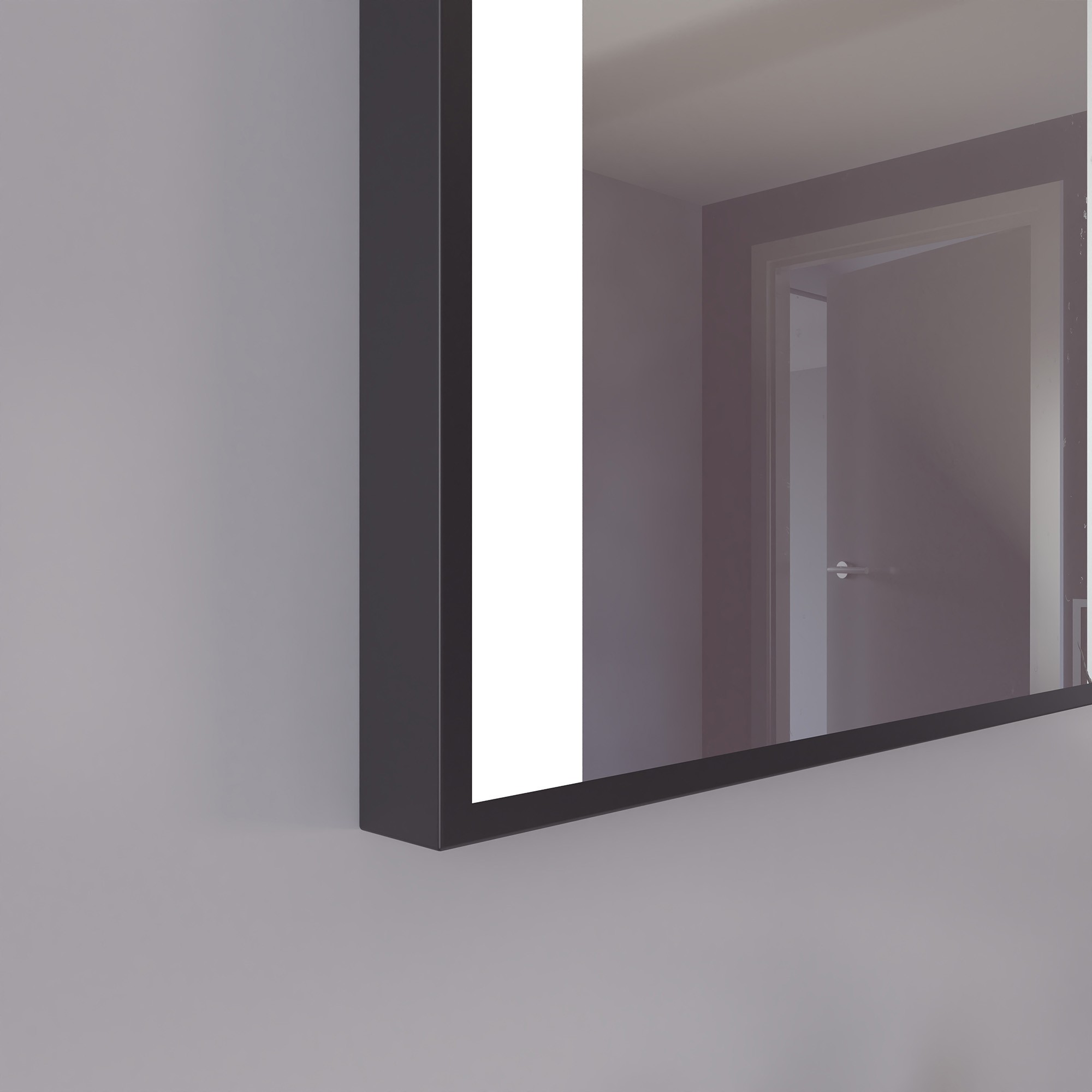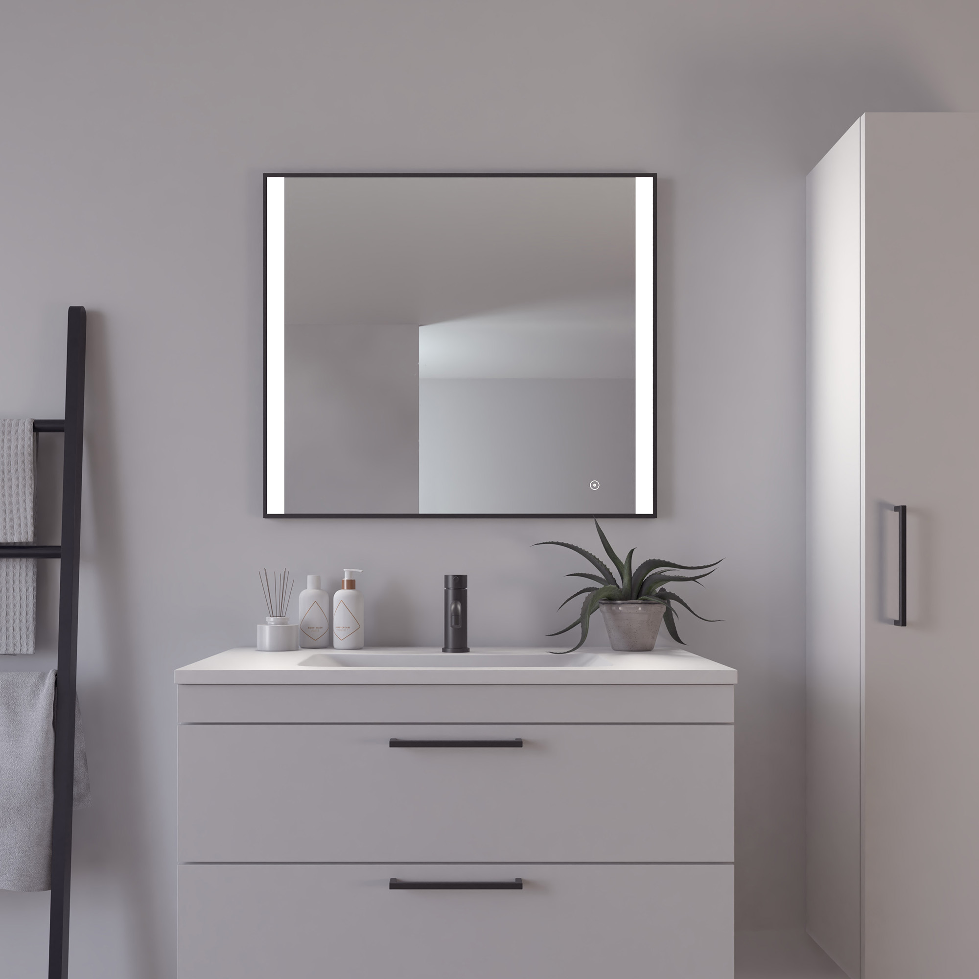 Fyrkantig badrumsspegel med ljus och svart ram. Två ljusfält på varje sida som kan dimmas.