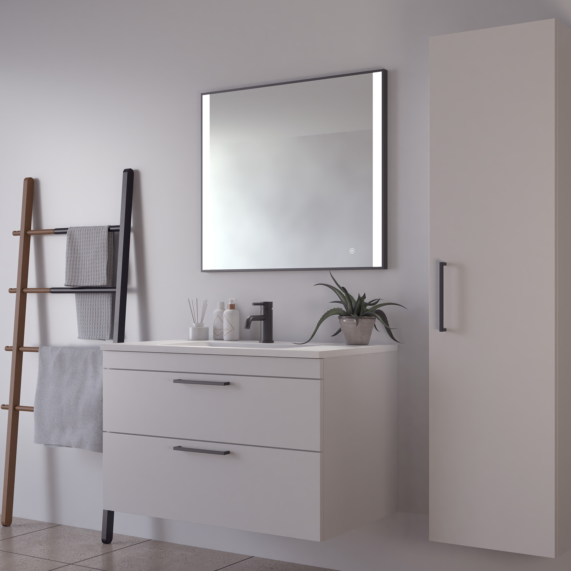 Libra är en fyrkantig badrumsspegel med distinkt svart ram och två ljusfält som kan dimmas. Ljuset justeras, tänds och släcks på spegelglasets touch-fält. Badrumsspegeln kommer ihåg den sista positionen både när du använder väggkontakten eller spegelns touch-fält.